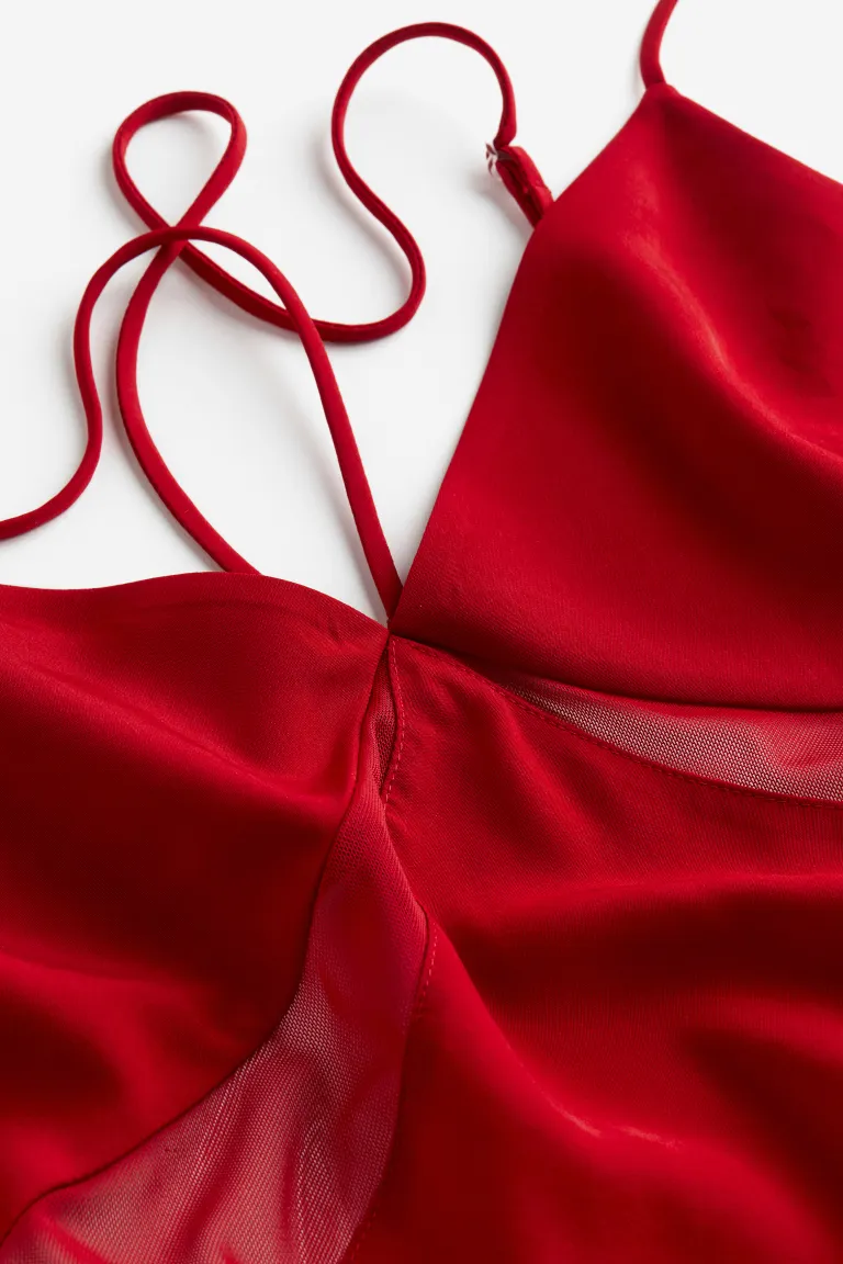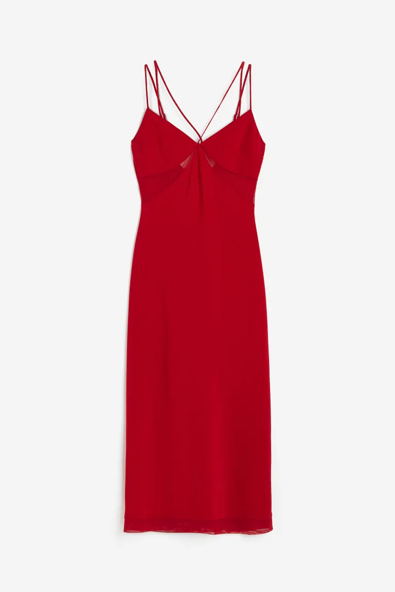 Long, fitted dress in woven fabric with mesh insets below the bust and at the hem. Double, adjustable spaghetti shoulder straps, two of which cross at the back. Concealed zip at the back. Lined over the bust.