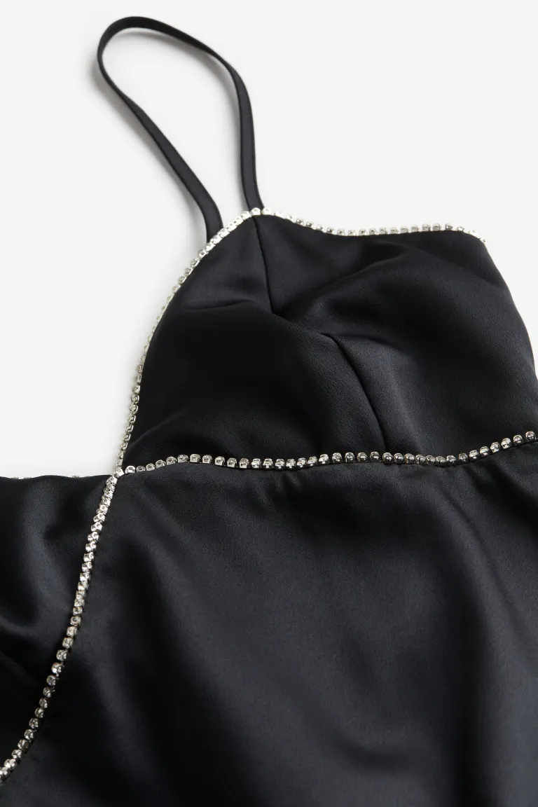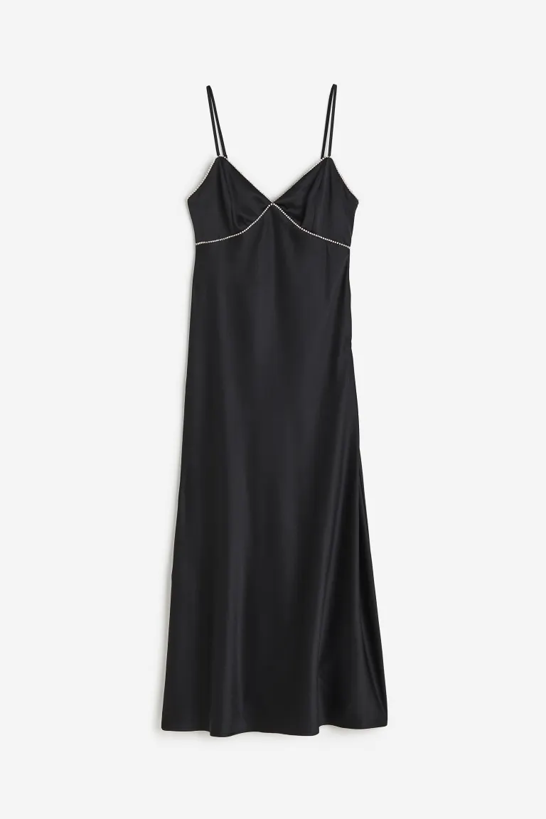 Calf-length dress in softly draping satin decorated with sparkling rhinestone chains around the neckline and below the bust. V-shaped neckline, narrow, adjustable shoulder straps, shaped cups and a concealed zip at one side. Fitted bodice and a gently flared skirt. Lined over the bust.
