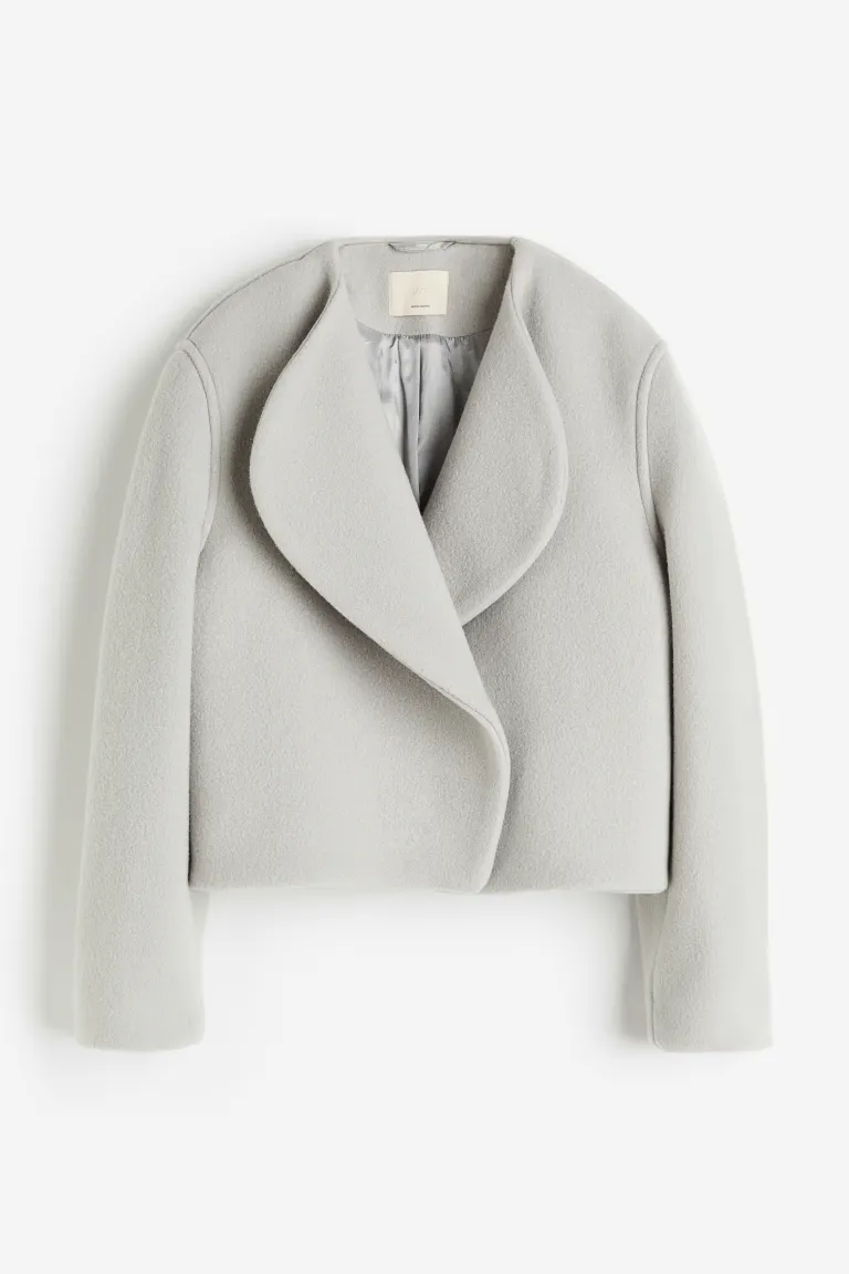 – Oversized jacket in a woven wool blend with a round neckline, wrapover front, gently dropped shoulders and long, tapered sleeves.